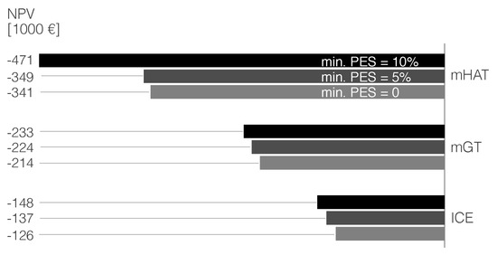 Environmental conditions, namely temperature, can affect the performance of mGT and ICE units: the higher the inlet air temperature, the lower the electrical efficiency. For example, for the case of the T100 mGT, the electrical efficiency descends from 30% at 15 to 29.4% at 20 [48]. The effect of inlet air temperature is not taken into account in this study though: the authors did not consider that it would have a substantial effect in the model results. As the temperatures rise, the heat demand decreases to minimum values and the mGT and ICE units are then shut down (see Section 4.1 for more details on how the units operate in the model). For the case of the mHAT unit, the effect of rising inlet temperatures is filtered out by the injection of water, as further explained in [18,21].