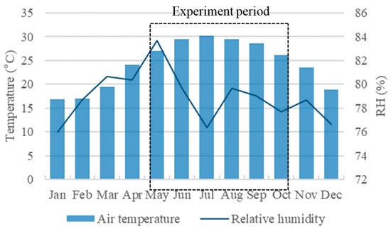 Field measurements were conducted on the rooftop of a multistory student dormitory in a university (24°10′54.0″ N 120°36′04.3″ E) located in the metropolitan area of Taichung, the third largest city in Taiwan. According to the East Asia map of the Koppen climate classification, the site is located in a warm oceanic climate/humid subtropical climate (Cfa) zone with the lowest monthly average temperature of 16.8 °C in January and highest temperature of 30.1 °C in July for the years 2014–2016; additionally, the lowest monthly relative humidity is 76.0% in January, and the highest relative humidity is 83.7% in May (Figure 1) [25]. Figure 2 shows the floor plans of the fourth and fifth floors (experiment site) and the experimental setup.