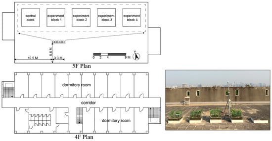 In summer 2017, five 50 × 50 × 10 cm3 (length [L] × width [W] × height [H]) cement boards capped with ceramic tiles were placed on a flat rooftop to simulate a flat bare roof (Figure 2). Five 50 × 50 × 4 cm3 (L × W × H) Styrofoam boards were placed under the cement boards to block heat conduction from the surrounding bare rooftop. All cement boards were placed close to the middle left of the bare rooftop. They were exposed to direct sunlight at all times, without any shadow interference from surrounding building walls or parapet walls. Four 50 × 50 × 30 cm3 (L × W × H) glass tanks were placed on top of four cement boards. The glass tanks helped avoid shadow interference from neighboring tanks. One cement board without any tank was exposed directly to the sunlight to simulate a bare rooftop as a control (Figure 2). The experiment tanks were approximately the same size as those used in the studies of Song et al. [31], and Huang et al. [32]. Fifteen dormitory rooms were located directly under the bare rooftop. An extensive green roof system on the bare rooftop would help reduce the temperature of the bedrooms below and hence increase the students’ living comfort [33,34]. Because heat always flows out of a room and a green roof would act as a heat sink in a green-roofed building during daytime in sunny days, the indoor temperature of a room underneath a green roof is lower than that of a room underneath a common roof during daytime [33]. Based on field measurements, the indoor temperature underneath a green roof was 2°C lower than that under a common roof at noon with strong solar radiation [33,34].