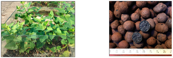 LECA (Figure 3) was selected for mixing with the conventional garden soil, composed of sandy loam:compost = 3:1, to reduce the weight load of the building structure [26] and the thermal conductivity of the growth medium, which, in turn, would lead to temperature reduction of the underlying bare rooftop [23,24]. Sandy loam is capable of quickly draining excess water, however, it cannot hold significant amount of water and nutrients for plants. The addition of the compost would help increase the the water-holding and nutrient-holding capacity of the soil for plants. The designed conventional garden soil supports the growth of various plants, including vegetables. LECA is a lightweight aggregate produced by baking a mixture of clay powder and saw dust for 7 h at 1000 °C [27]. It has a hard ceramic shell, a porous core, and a porous surface [27,28]. LECA is durable, stable, and nontoxic [27,28]. It can be used to increase the breathability of plant roots, support plants, and prevent soil hardening when it is thoroughly mixed with conventional garden soil or laid at the bottom of the tank [26]. When mixed with cement, LECA can be used to lighten the structure weight load and for thermal insulation and acoustic insulation in buildings [29,30].