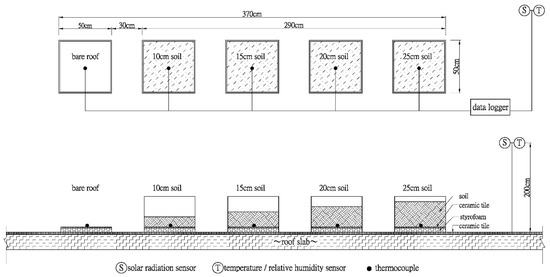 Five measurement points were placed at the bottom center of the extensive roof and at the center of the simulated bare roof. Thermocouples (Onset Computer Corporation) were placed horizontally in close contact with the surface to measure the temperature accurately. Air temperature, relative humidity, and solar radiation were measured at a point 2 m above the rooftop surface [35,36] and 5.6 m (shortest distance) away from the parapet walls to prevent any reflective interference from the bare rooftop and parapet walls. A thermal monitoring system comprising three HOBO micro station data loggers (Onset Computer Corporation) was employed to record all measurements at intervals of 10 min. The experiment was conducted in the following four periods: 13–23 May 2017, 14–26 July 2017, 20–27 September 2017 and 28 September–13 October 2017. Please refer to Table 1 for the equipment list.