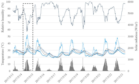 The first stage (Figure 4) involved comparing the thermal performance of extensive roofs with four different depths of conventional garden soil: 10, 15, 20, and 25 cm. Table 2 shows that the mean air temperature and mean rooftop temperature were 25.15 and 28.44°C, respectively; the ranges of air temperature and rooftop temperature were 19.37–33.29 °C and 18.82–52.67 °C, respectively; the maximum solar radiation was 1170.60 W/m2; the mean relative humidity was 85.54%. A period of 24 h was selected for further analysis based on the following criteria: high temperature at noon, relatively stable air temperature progression over 24 h, and ample solar radiation with relatively little cloud interference. The date selected was 14–15 May 2017 (Figure 5). The time frame 07:00–14:00 was further selected to compute the passive cooling effects among all extensive roofs for comparisons within and between different stages, because this is the single maximum period of time frame when the passive cooling effects were concurrent across four different stages. According to the experiment results, the passive cooling effects occurred over time frame 07:00–16:00, 07:00–14:00, 07:00–16:00, and 07:00–17:00 for the fist (5 July), second (25 July), third (24 September), and fourth (1 October) stages, respectively.