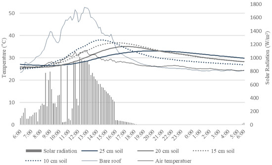 Temperatures and solar radiation in the cases of 10, 15, 20, and 25 cm conventional garden-soil roofs without plants (14 May 2017 05:59:44 to 15 May 05:49:44).
