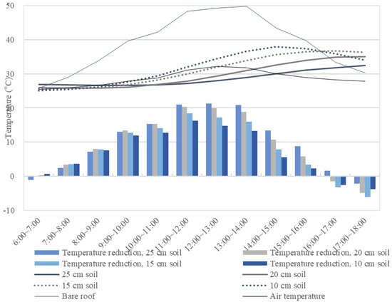 Temperature reductions in the cases of 10, 15, 20, and 25 cm conventional garden-soil roofs without plants (14 May 2017 07:00–14:00).