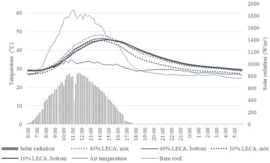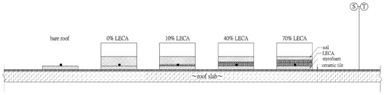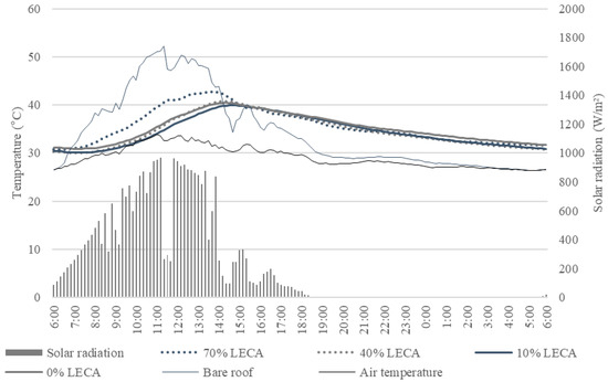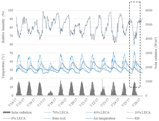 The second stage (Figure 8) involved investigating the reductions in average temperature and heat amplitude owing to the extensive roof when different proportions of LECA were laid at the bottom of the tanks. The roofs with 0%, 10%, 40% and 70% LECA have 0, 1, 4, 7 cm of LECA laid at the bottom of the tank, and 10, 9, 6, 3 cm of conventional garden soil laid at the top of the tanks, respectively. Table 5 shows that the mean air and rooftop temperatures were 29.15 and 33.96 °C, respectively; the ranges of air and rooftop temperatures were 25.53–33.94 °C and 25.45–52.24 °C, respectively; the maximum solar radiation was 1138.10 W/m2; and the mean relative humidity was 80.88%. A period of 24 h was selected for further analysis based on the aforementioned criteria. The date selected was 25–26 July 2017 (Figure 9).