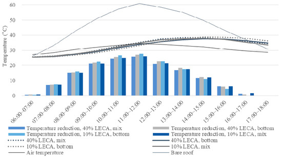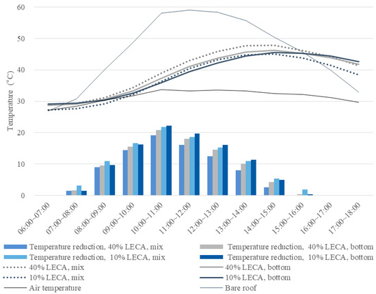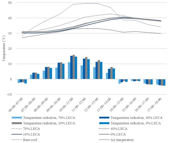 Temperature at the bottom of the extensive roofs and temperature reductions in the cases of the extensive roofs with 0%, 10%, 40%, and 70% LECA laid at the bottom without plants (25 July 2017 06:00:09 to 25 July 2017 17:50:09).