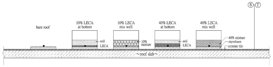 Roofs with various proportions of LECA exhibited different insulation, absorption, and evaporation effects in the garden-soil layer and additional insulation, absorption, and evaporation effects in the LECA layer. Consequently, the roofs with 10% and 40% LECA were not only lighter than the 0% LECA (conventional garden-soil) roof but also exhibited a lower average temperature in the bare rooftop than in the 0% LECA roof. On 25 July from 07:00–14:00 (Table 6, Figure 10), when the average air temperature was 31.48 °C and the average rooftop temperature was 44.28 °C, the average bottom temperatures of the roofs with 10% and 40% LECA were 33.71 and 34.34 °C, respectively, whereas the average bottom temperature of the roof with 0% LECA was 34.74 °C. These results indicated that roofs with 10% and 40% LECA reduced the average rooftop temperature by an additional 1.03 and 0.4 °C, respectively. The roof with 70% LECA (37.44 °C) exhibited inferior temperature-reduction performance than the 0% LECA roof (34.74 °C) by a difference of 2.70 °C. Consequently, the proportions of 10% and 40% LECA were selected for the third and fourth stages.