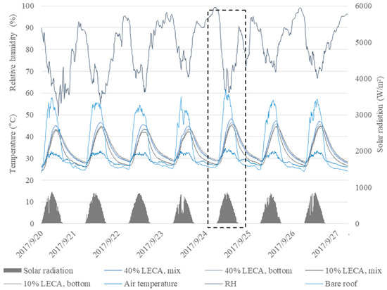The third stage (Figure 12) involved investigating the reductions in temperature and heat amplitude of the bare rooftop owing to the extensive roofs with 10% and 40% LECA laid at the bottom or mixed with the conventional garden soil without plants. Table 8 shows that the mean air and rooftop temperatures were 29.29 and 35.42 °C, respectively; the ranges of air and rooftop temperatures were 25.74–34.76 °C and 23.55–61.49 °C, respectively; the maximum solar radiation was 873.10 W/m2; and the mean relative humidity was 80.93%. A period of 24 h was selected for further analysis based on the aforementioned criteria. The date selected was 24–25 September 2017 (Figure 13).