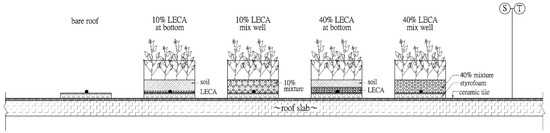 To reduce construction costs, the structural loads of most buildings in Taiwan frequently only barely meet minimum requirements. According to architectural regulations, the live load of a building—that is, the static and constant forces to which a building is subjected for an extended time period—is 200.00 kg/m2 [15]. Thus, lightweight green-roof systems are recommended in Taiwan. Quality growth medium for extensive green roofs should drain well, demonstrate excellent water-holding and nutrition-holding capabilities, provide sufficient support for plant roots in shallow soil depths of 10–20 cm, and be lightweight. A common growth medium utilized for extensive green roofs is a mixture of sandy loam, organic matter, and a lightweight growth medium. The most common organic matters are compost and peat, and the most common lightweight growth medium are perlite, zeolite, pumice and lightweight expanded clay aggregate (LECA) [16,17,18,19,20,21]. A common formula used for lightweight growth medium is 15–30% sandy loam, 20–30% organic matter, and 50–70% lightweight growth medium [16,17,18,19,20,21].