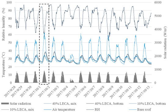 The fourth stage (Figure 16) involved investigating the reductions in temperature and heat amplitude of the bare rooftop owing to the extensive roofs with 10% and 40% LECA laid at the bottom or mixed with the soil and with plants. Table 11 shows that the mean air and rooftop temperatures were 28.80 and 33.80 °C, respectively; the ranges of air temperature and rooftop temperature were 24.12–35.72 °C and 23.04–61.90 °C, respectively; the maximum solar radiation was 921.90 W/m2; and the mean relative humidity was 82.15%. A period of 24 h was selected for further analysis based on the aforementioned criteria. The date selected was 1–2 October 2017 (Figure 17).