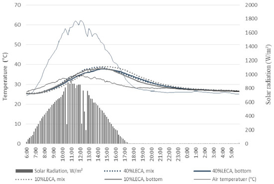 Temperatures and solar radiation in the cases of roofs with 10% and 40% LECA laid at the bottom without plants, and of 10% and 40% LECA mixed with the soil without plants (24 September 2017 06:08:41 to 25 September 2017 05:58:41).