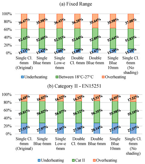Comfort rates according to the fixed range (a) and the EN15251 for Category II (b) considering different glazing types.