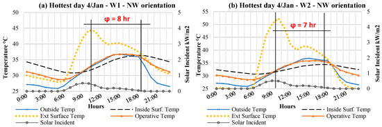 Figure 10 and Figure 11 depict the results regarding surface temperatures of the wall in the original state (a) and for the W2 configuration (b). For a southwest orientation (Figure 10), the external surface temperature is higher with the W2 than with the W1. Nonetheless, the internal one has significantly decreased with the wall W2, which also collaborated to slightly decrease the operative temperatures of the thermal zone. For a northwest orientation (Figure 11), the same performance is recorded, but the solar incident is higher, causing higher external surface temperatures. However, as W1 with NW orientation is 30 cm-thick, the internal surface temperatures are lower, and with the addition of 5 cm-thick insulation for the W2 configuration, the internal surface temperature becomes even lower also collaborating for the slightly lower operative temperatures of the zone. It is important to highlight that the time shift values referred in the graphs were calculated according to the results obtained from the simulations during the hottest day of a year, being thus the time difference between the maximum external surface temperature and the maximum internal one.
