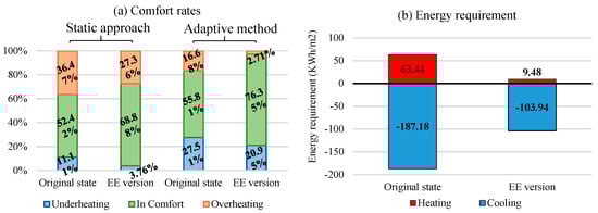 The next step is to simulate the whole building considering the improvements for the roofs and walls together. Thus, for this section an insulation thickness of 5 cm for the roof and 3 cm for the walls is evaluated. The results regarding comfort rates and energy requirement are depicted in Figure 15. It can be seen that the overheating and underheating rates have significantly decreased, in fact, considering the adaptive method the building is overheated only 2.71% of the year. In general, the adaptive method tends to be permissive with higher temperatures but not with lower temperatures, delivering an underheating rate of 20.95%. However, with the static approach, it demonstrates that the building is under 18 °C only 3.76% of the year. Regarding the energy requirement, the heating needs per square meter decreased 85% regarding the original state of the building and the cooling needs decreased around 45%, having now a value of 104 KWh/m2.