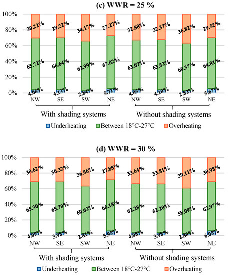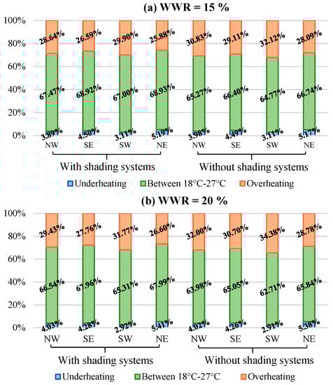 Finally, the last target of this study is to evaluate different WWR for the thermal zone under analysis according to each orientation and taking as a base the energy efficiency version of the building. Four different WWR were evaluated on each orientation, with and without the use of shading systems, and the results regarding comfort rates employing the static approach are depicted in Figure 17. It was recorded that the use of shading systems can increase by around 2.6% on average the comfort rates considering all the WWR used, being this rate higher as the WWR increases.