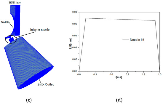 Simulation models. (a) ”Spray G” nozzle, (b) GDI injector head structure, (c) Mesh model, (d) Injector needle lift curve.