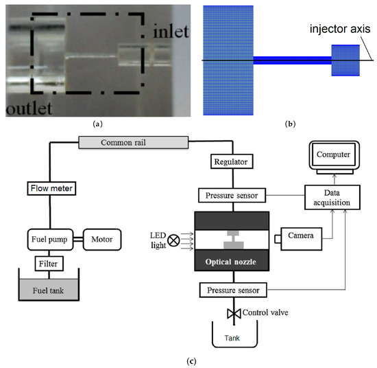 To validate the above mathematical models, a structural nozzle (α = 0) is used in the following experiment setup, which is shown in Figure 3a. The model is established and meshed by the CFD code AVL-FIRE. The mesh is shown in Figure 3b. The numerical results could be validated by the experimental measurements of the mass flow rate, momentum flux, or effective injection velocity [19]. In order to validate the effectiveness of the turbulence model and cavitation model, we compared the development of cavitation under different inlet pressures with images which were obtained by visualization technology. Next, the turbulence was tested by a mass flow comparison between the simulation and experimental results.