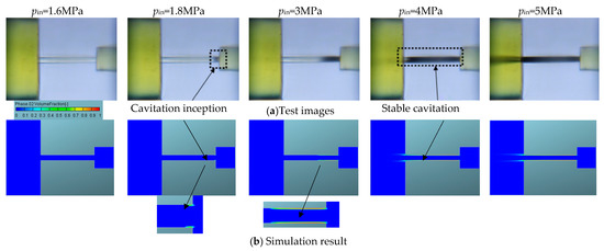 The simulation and experiment results of cavitation inception and development, and the stable stage of cavitation in the nozzle were compared in Figure 4. The cavitation phenomenon started at the nozzle orifice under pin = 1.8 MPa and back pressure pb = 0.3 MPa, and the cavitation area continued to expand from the entrance to the nozzle outlet with the increasing of the pin. As the pin went up to 5 MPa, the cavitation area almost reached a stable cavitation. Thus, the mathematic model was deemed suitable for the analysis of the cavitation phenomenon in an injector nozzle.