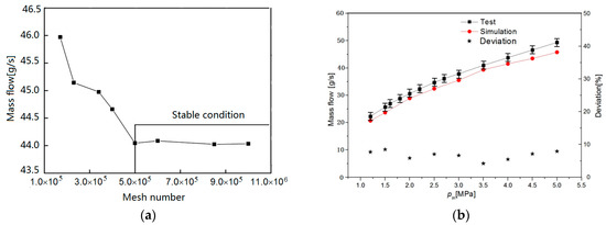 Comparison of experimental data and simulation result. (a) Grid independency, (b) Mass flow comparison.