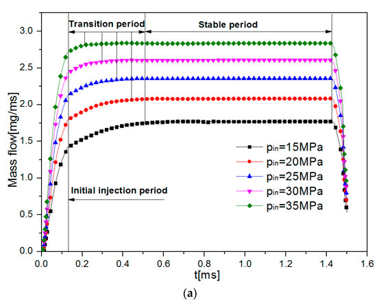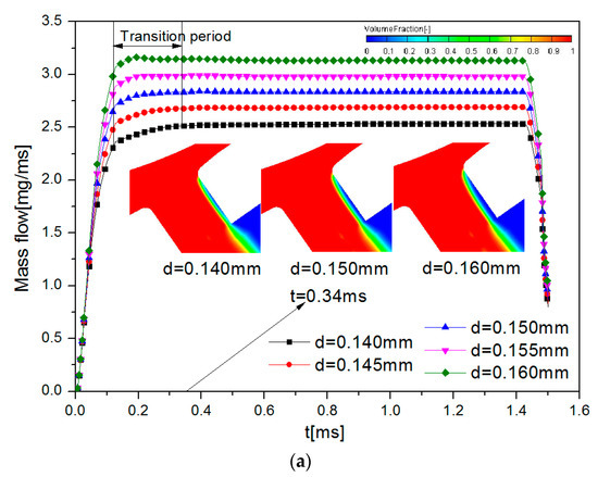 Figure 8a showed the injection mass flow under different injector nozzle diameters under the injection pressure of 35 MPa and the injection back pressure of 0.5 MPa. Under the current injector nozzle structure, the transition period of the fuel injection rate became shorter with the increase of the nozzle diameter. According to the mass conservation equation,