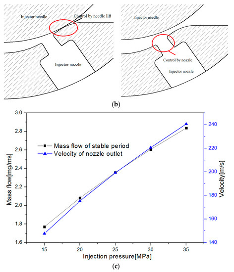 Figure 6a showed the injection law curve under different injection pressures. The diameter of the injection hole was 0.15 mm and the back pressure of the injection was 0.5 MPa. To easily analyze the influence of the different injection pressures on the injection process, the injection process was divided into the initial injection period, the transition period, and the stable period. In the initial stage of injection, with the opening of the needle valve, the injection rate increased rapidly. This was due to the opening of the needle valve and the increase of the minimum flow cross section in the injector, which resulted in the rapid increase of the injection rate. During the initial injection period, the increase of fuel injection rate increased with the increase of the injection pressure. According to the mass flow Formula (5), the increase of the injection rate was proportional to the square root of the pressure difference (). During the transition period, the injection rate increased slowly and tended to stabilize gradually. The transition period became shorter with the increase of the injection pressure. At this stage, the minimum cross-section of the fuel flow was transferred from the needle valve control area to the nozzle area, as shown in Figure 6b. Through the comparison and analysis of the velocity field and cavitation development process, we found that the gas phase and liquid phase flow velocity in the injection hole increased and the injection rate became stable more quickly with the increase of the injection pressure. During the stable period, the steady injection rate increased with the increase of the injection pressure, and the increase amplitude of the injection rate decreased gradually.