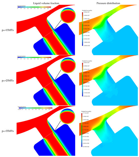 Figure 6c showed the variation of the injection rate and nozzle exit velocity with the injection pressure during the steady state period. The mass flow rate of the nozzle and the jet velocity at the outlet showed the same change tendency which rose with the increase of the injection pressure. According to the gas and liquid phase distribution and pressure distribution of the injection hole in the steady state period of each injection pressure in Figure 7, it could be seen that with the increase of the injection pressure, the low pressure region on the wall of the nozzle hole increased, the cavitation degree increased, and the liquid phase duty ratio decreased. As a result, the effective fuel flow area would reduce. When the injection pressure was 15 MPa, the volume fraction of the liquid phase at the exit section was about 0.9025. When the injection pressure was increased to 35 MPa, the volume fraction of the liquid phase decreased to 0.8769.