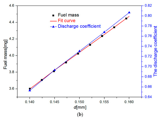 It can be seen that the circulating injection fuel mass of the single-nozzle should be quadratic with the nozzle diameter. However, due to the small variation range of the nozzle diameter, the injection quantity of the single-hole cycle can be approximately regarded as a linear change with the increase of the injector nozzle diameter. As a result, the sensitivity coefficient of the circulation injection fuel mass of the single-nozzle to the nozzle diameter is constant. In order to describe the relationship between the fuel injection rate and nozzle diameter, a linear function was used to fit the model.