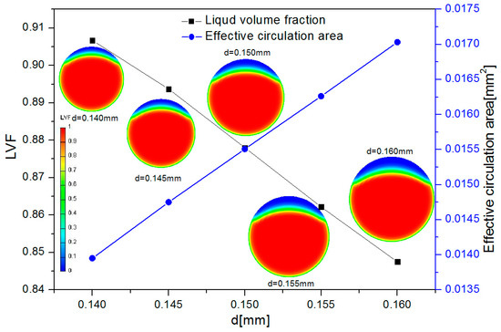 In order to understand clearly the influence of the nozzle diameter on the single-hole circulating injection quantity, Figure 9 showed the relationship between the liquid phase ratio and the effective flow cross section with the nozzle diameter during the steady state period. It can be seen from the figure that with the increase of the nozzle diameter, the flow velocity in the nozzle increased and the negative pressure region became larger. Finally, the cavitation phenomenon intensified, which resulted in the decrease of the liquid phase ratio at the nozzle outlet. The effective flow cross-section area at nozzle outlet was calculated by liquid phase ratio, the effective flow cross-section area increased with the increase of the nozzle diameter.