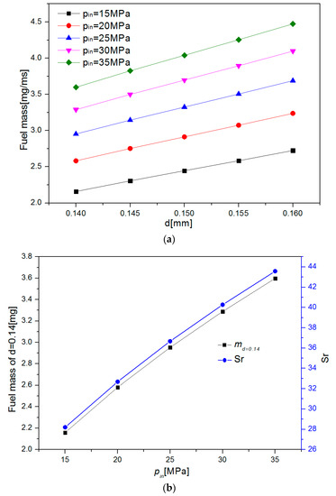 Figure 10 showed the variation of the fuel injection rate of the single-hole cycle with the increase of the nozzle diameter under different injection pressures. The single-nozzle injection fuel mass under different injection pressures showed the same trend, and increased approximately linearly with the increase of the nozzle diameter. In order to analyze the effect of the injection pressure on the sensitivity coefficient of the single nozzle cycle fuel injection to the nozzle diameter, the sensitivity coefficients corresponding to the nozzle diameter were obtained by using Formula (6), as shown in Figure 10b. The sensitivity coefficient corresponding to the injector nozzle diameter increased nonlinearly with the increase of the injection pressure. This indicated that the increase of the injection pressure lead to the enhancement of the sensitivity of the fuel mass to the nozzle diameter. Therefore, with the increase of injection pressure, the requirement for the processing quality of GDI nozzle diameter should be improved.