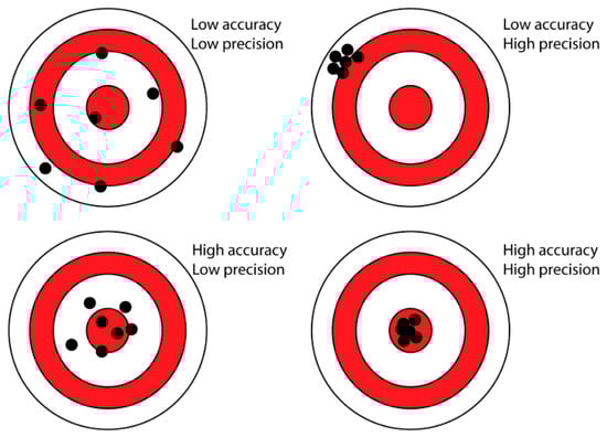 A graphical representation of accuracy and precision. Copyright: www.exammasters.ca.