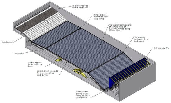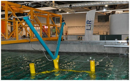 The SCDnezzy2 model was tested in the Deep Ocean Basin of the Lir NOTF. The basin, shown in Figure 7, has dimensions of 35 m long × 12 m wide × 4 m deep and is equipped with 16 hinged force feedback paddles capable of a peak wave generation condition of Hs = 0.6 m, Tp = 2.7 s, and Hmax = 1.1 m. A movable floor plate allows the water depth to be adjusted to a maximum of 3 m. During testing of the SCDnezzy2 model, the tank water depth was set to 1.111 m in order to simulate a water depth of 40 m at full scale.