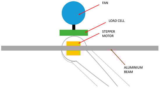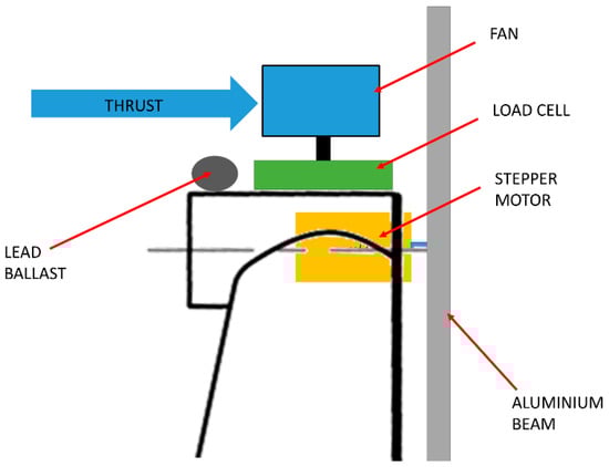 The experimental configuration at each nacelle is shown in Figure 3, and the direction of the wind thrust is indicated by the blue arrow. Further views and schematics are provided in Figure 4, Figure 5 and Figure 6. As can be seen, the rotating weighted beams intermittently obstructed the air intakes of the ducted fans during operation.