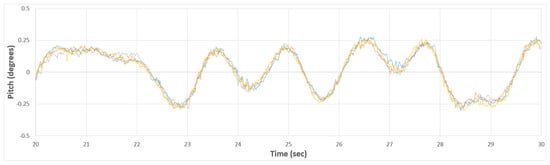 The shaded region in Figure 9 indicates the error range which can be attributed to sensor noise, the values in Table 2. The orange data points indicate the error range observed across the 5 repetitions for the 10 top peaks, the precision metric used in [18]. As can be seen in Figure 8 and Figure 9, the magnitude of the error range is not well correlated to the magnitude of the value being measured with 8 of the top 10 peak error range values being exceeded for at least 85% of the 10-min time concurrent time series for Group B in pitch. Thus, examining the error in the top 10 peaks or maximum peak does not give an appreciation of the error observed across the full time series. To capture this detail, the precision metric used in this paper will be ; that is, the error range which is exceeded 5% of the time for concurrent time series with 5 repetitions. For the data presented in Figure 9, the = 0.49 degrees.