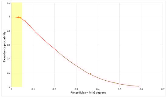 The error range (maximum value–minimum value) was then calculated at every time step for each group of time series. As mentioned previously, all motion data were recorded at 96 Hz and line load data at 100 Hz, thus a total of 57,600 error range values were calculated for motions and 60,000 for line load over the 10 min active test period for each Group of 5 repetitions. For visualisation, these error range data are presented as exceedance probability plots; a sample is shown in Figure 9.