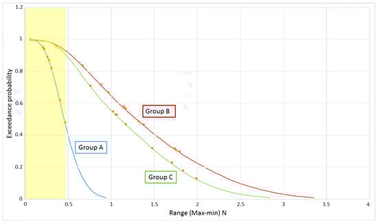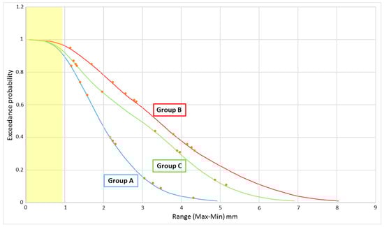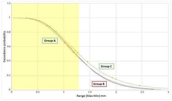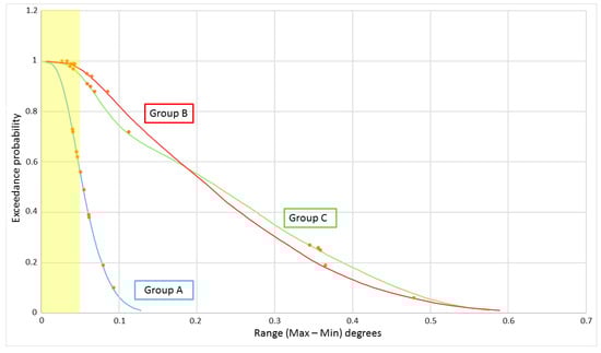 Exceedance plots for pitch error ranges for Groups A, B, and C.