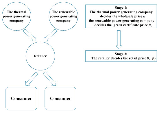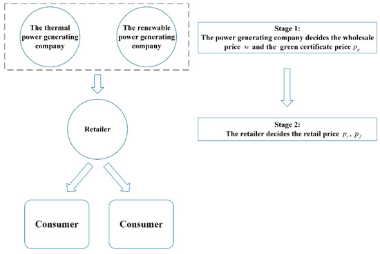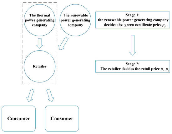 The model hypothesizes that power generating companies first select the wholesale price and the green certificate price. Then, the retailer purchases electricity from the wholesale market and selects the retail price of the two types of power. Thus, the model is a typical Stackelberg model, which can be resolved using backward induction.