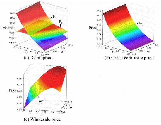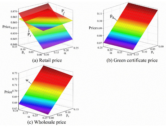 Figure 4, Figure 5 and Figure 6 plot the trend of the price in case 1. First, Figure 4 shows the trend of the price under different levels of the quota obligation, , and the permit price, . We hypothesize that the consumer’s environmental awareness is . In Figure 4, when the permit price rises from 0 to 0.15 , the wholesale price and thermal power retail price increases about 0.051 CNY and 0.036 CNY, respectively, while the RES-E retail price only rises about 0.004 CNY. Thus, the difference between the thermal power retail price and the RES-E retail price shrinks as the permit price rises. If the permit price is higher than 0.11 , the thermal power retail price is higher than the RES-E retail price. Besides, the green certificate decreases about 0.044 CNY.