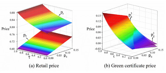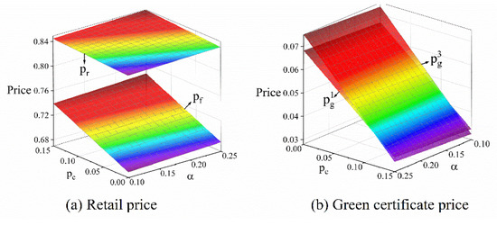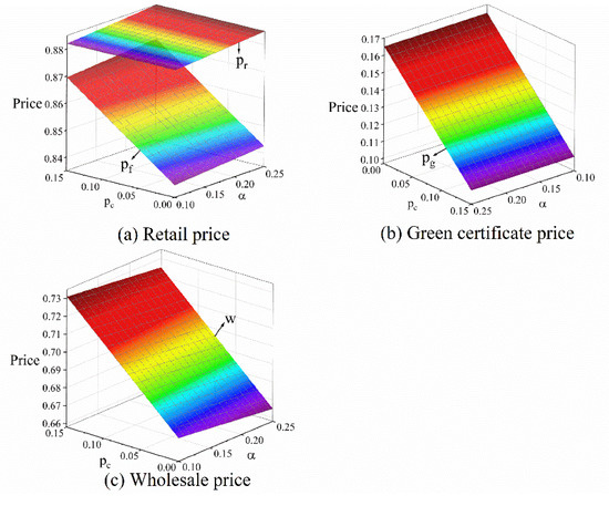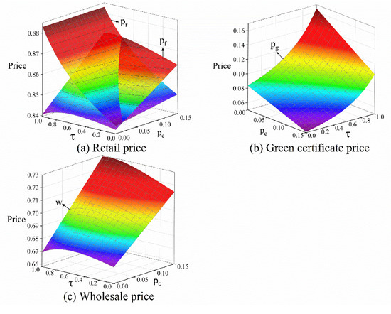 Figure 7, Figure 8 and Figure 9 depict the trend of the price in case 2. In Figure 7, the trend of the price under different levels of the permit price and the quota obligation in case 2 are displayed. We substituted the wholesale price, , in the green certificate price Equation (23) using the wholesale price in case 1 and case 3, which is denoted by and in the figures, respectively. The trend of the retail price and the green certificate price in Figure 6 is consistent with case 1. However, the RES-E retail price is always higher than the thermal power retail price in case 2. In Figure 7, when the permit price rises from 0 to 0.15 , the thermal power retail price and the RES-E retail price increase about 0.06 CNY and 0.004 CNY, respectively, while the green certificate price, , and green certificate price, , decreases about 0.034 CNY and 0.043 CNY. When the quota obligation increases from 10% to 25%, the thermal power retail price and RES-E retail price increase about 0.006 CNY and 0.004 CNY, respectively, while the green certificate price increases about 0.002 CNY.