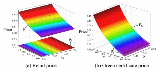 In Figure 8, when the consumer’s environmental awareness is , the RES-E retail price is not affected by the permit price. The aforementioned phenomena are also observed in Figure 9. In Figure 9, when the environmental awareness increases from 0 to 1, the RES-E retail price by about 0.080 CNY to 0.065 CNY, while the thermal power retail price is not affected. The green certificate price, , and green certificate price, , rises about 0.161 CNY to 0.115 CNY.