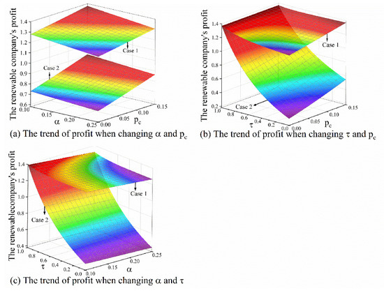 Now, we further investigated the trend of profits. First, Figure 11 compare the renewable power generating company’s profits (abbreviated as the renewable company’s profit in Figure 11) in case 1 with the profits in case 2. When the permit price rises from 0 CNY to 0.15 CNY, the renewable power generating company’s profits in case 1 and the renewable power generating company’s profits in case 3 increase 0.10 CNY and 0.18 CNY, respectively. However, when the quota obligation rises from 10% to 25%, the renewable power generating company’s profits decreases about 0.07 CNY and 0.04 CNY, respectively. When the consumer’s environmental awareness increases, the renewable power generating company’s profits increase in case 2, whereas the renewable power generating company’s profits initially decrease and then increase in case 1. Furthermore, the range of change for the renewable power generating company’s profit shrinks with the increase in the consumer’s environmental awareness. If the consumer’s environmental awareness is , there is no difference between the renewable power generating company’s profits in cases 1 and 2.