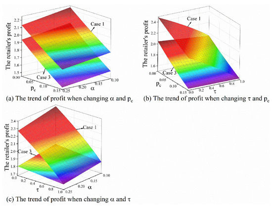 The retailer’s profits in case 1 and case 3 are compared in Figure 12. We observe that the retailer’s profits decrease when the permit price, the quota obligation, and the consumer’s environmental awareness increase. If the consumer’s environmental awareness is , the retailer’s profits in case 1 are larger than the profits in case 3 under different levels of and . Nevertheless, the retailer’s profits in case 1 are very sensitive to environmental awareness. In Figure 12c, when the consumer’s environmental awareness rises from 0 to 1, the retailer’s profits in case 1 decrease about 0.52 CNY to 0.55 CNY. If the consumer’s environmental awareness is , the retailer’s profits in case 1 are identical with the profits in case 3.