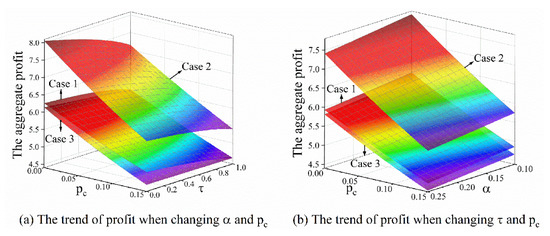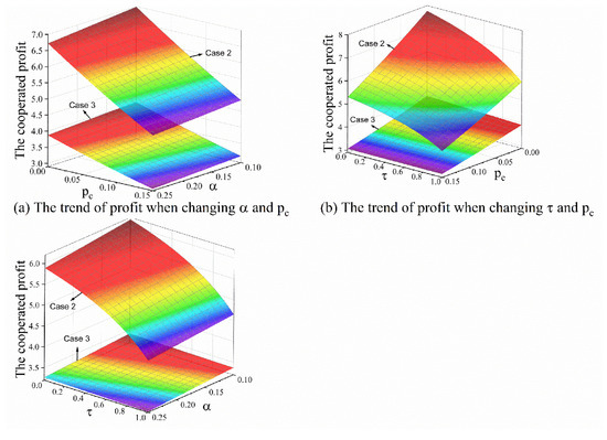 The comparison between the cooperative profits in case 2 and the cooperative profits in case 3 are shown in Figure 13. The cooperative profits drop when the permit price and quota obligation increase, although the influence of the quota obligation is minor. We find that the profits in case 2 are always larger than the profits in case 3 under different levels of , , and . Furthermore, in Figure 13c, when the consumer’s environmental awareness rises from 0 to 1, the cooperative profits in case 2 decrease about 1.44 CNY to 1.55 CNY, but the cooperative profits in case 3 are not affected by the consumer’s environmental awareness.