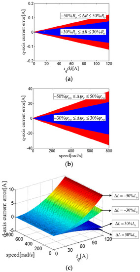 d- and q-axis current errors under parameter mismatches. (a) q-axis current error under resistance parameter mismatch; (b) q-axis current error under flux linkage parameter mismatch; (c) d-axis current error under inductance parameter mismatch.