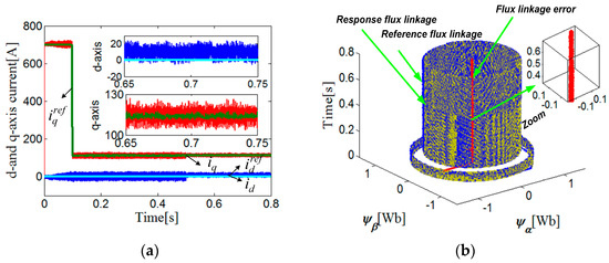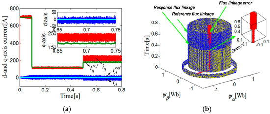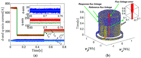 Simulation results of the conventional PCC method under flux linkage parameter perturbation. (a) d- and q-axis current responses and references; (b) three-dimensional rotor flux trajectories.