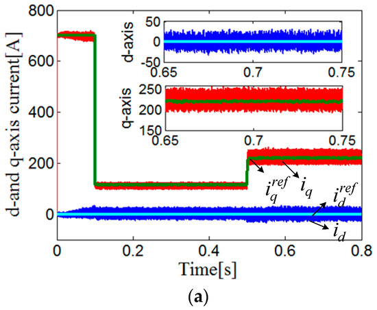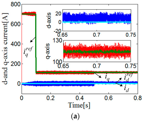 In this simulation, the inductance parameter perturbation value was set to zero initially. At 0.5 s, changed to . The simulation results are shown in Figure 4 and Figure 5.