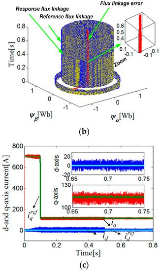 From Figure 8a, it can be seen that the d- and q-axis current steady error were respectively 12 A and −43 A after 0.5 s when using the conventional PCC, which were larger than those of simulations (a) and (b). The disturbance caused by the inductance and flux linkage parameter perturbations was also able to be accurately estimated when using the RNPCC, as can be seen in Figure 9. Furthermore, the d-axis and q-axis current steady error was effectively removed using the proposed composite integral terminal SMO. Figure 8b shows the three-dimensional rotor flux trajectories of the conventional PCC method under inductance and flux linkage parameter perturbation. Figure 9b shows the three-dimensional rotor flux trajectories of the RNPCC method under inductance and flux linkage parameter perturbation. The errors of α- and β-axis flux linkage were more serious than those of simulation (b) under inductance and flux linkage parameter perturbations, while still being nearly zero when using the RNPCC, as is clearly shown in Figure 8b and Figure 9b. The Comparison of the current tracking between the conventional PPC and RNPCC are provided in Table 2.