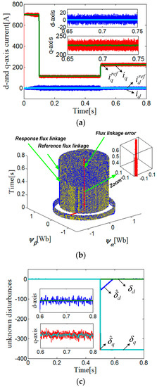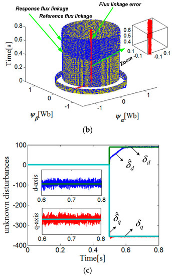 From Figure 6a, it is known that the q-axis current response values cannot track current references under flux linkage parameter perturbation when using the conventional PCC method. After 0.5 s, the q-axis current response value and reference value were respectively 225 A and 185 A, and the steady error was −40 A. When using the RNPCC method, the disturbance was accurately estimated using the proposed composite integral terminal SMO, as can be seen in Figure 7. From Figure 7a, it can be seen that the steady state current error can effectively be removed by injecting the estimated external disturbance value. Figure 6b shows the three-dimensional rotor flux trajectories of the conventional PCC method under flux linkage parameter perturbation. Figure 7b shows the three-dimensional rotor flux trajectories of the RNPCC method under flux linkage parameter perturbation. Note that there are large α- and β-axis flux linkage errors when the flux linkage parameter is changed suddenly at 0.5 s. The reason for this is that the conventional PCC produces a large q-axis current steady error under flux linkage parameter perturbation.