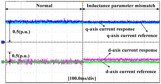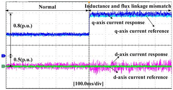 The experimental results of the conventional PCC and proposed RNPCC under inductance parameter perturbation are shown in Figure 11 and Figure 12, respectively. From Figure 11, it can be seen that the d-axis current value was greater than the reference value, but the inductance parameter perturbation had little effect on the q-axis current when using the conventional PCC. Figure 12 shows that the d-axis current steady state error could be removed by using the proposed RNPCC. Figure 13 and Figure 14 show the control performance comparisons under flux linkage parameter mismatch. Figure 13 shows that the flux linkage parameter mismatch exerted an effect on the q-axis current response in the conventional PCC method. The q-axis current response value was greater than the current reference under flux linkage parameter mismatch. When using the RNPCC method, it can be observed from Figure 14 that the q-axis current response could track the current reference accurately and quickly. Figure 15 and Figure 16 show the control performance comparisons under inductance and flux linkage parameter mismatch. From Figure 15, it can be seen that neither the d-axis nor the q-axis current response could track the current reference. The q-axis value of the current response was greater than the current reference, whereas the d-axis current response value was less than the current reference when using the conventional PCC. Figure 16 shows that the proposed RNPCC could remove the steady state current error caused by the inductance and flux linkage parameter perturbations during steady state operation.