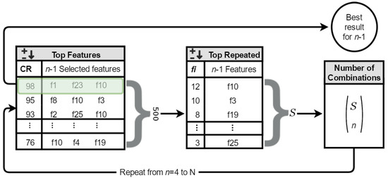 For the case n = 4 the best 20 frequent features (S = 20) of the case n = 3 will be used, generating a total of 4845 combinations of 4 characteristics. For the case n = 5 the best 15 features (S = 15) of the case n = 4 will be used, generating a total of 3003 combinations of 5 characteristics. Finally, for the case n = 6 the best 15 features (S = 15) of the case n = 5 will be used, generating a total of 3003 combinations of 6 characteristics.