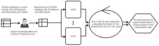 All the experiments (see Figure 3) use the data-set presented in Section 4.1, which contains 36 features, and each target has a label indicating normal state, warning state or alarm state. Warnings and alarms are integrated, therefore it becomes a binary classification problem. The selection of the best features to be used as input to the classification system is implemented as detailed in Section 2. Several experiments were performed using all the WT, and the best features, from 1 to 6, were obtained trough several feature selection algorithms. Panel (a) of Figure 4 shows the CR against the number of features for the quasi-optimal algorithm and all the WT. Results are very good in all the WT, reaching above 85% of CR when the number of features is 3 or higher. Adding new features slightly increases the CR, but for more than 4 features the change is almost imperceptible. Numerical results for these experiments (in terms of CR and F1) are detailed in Table 3. All results are obtained with k = 1 and we can see that the F1-score is close to 1 and highly correlated with the CR results.